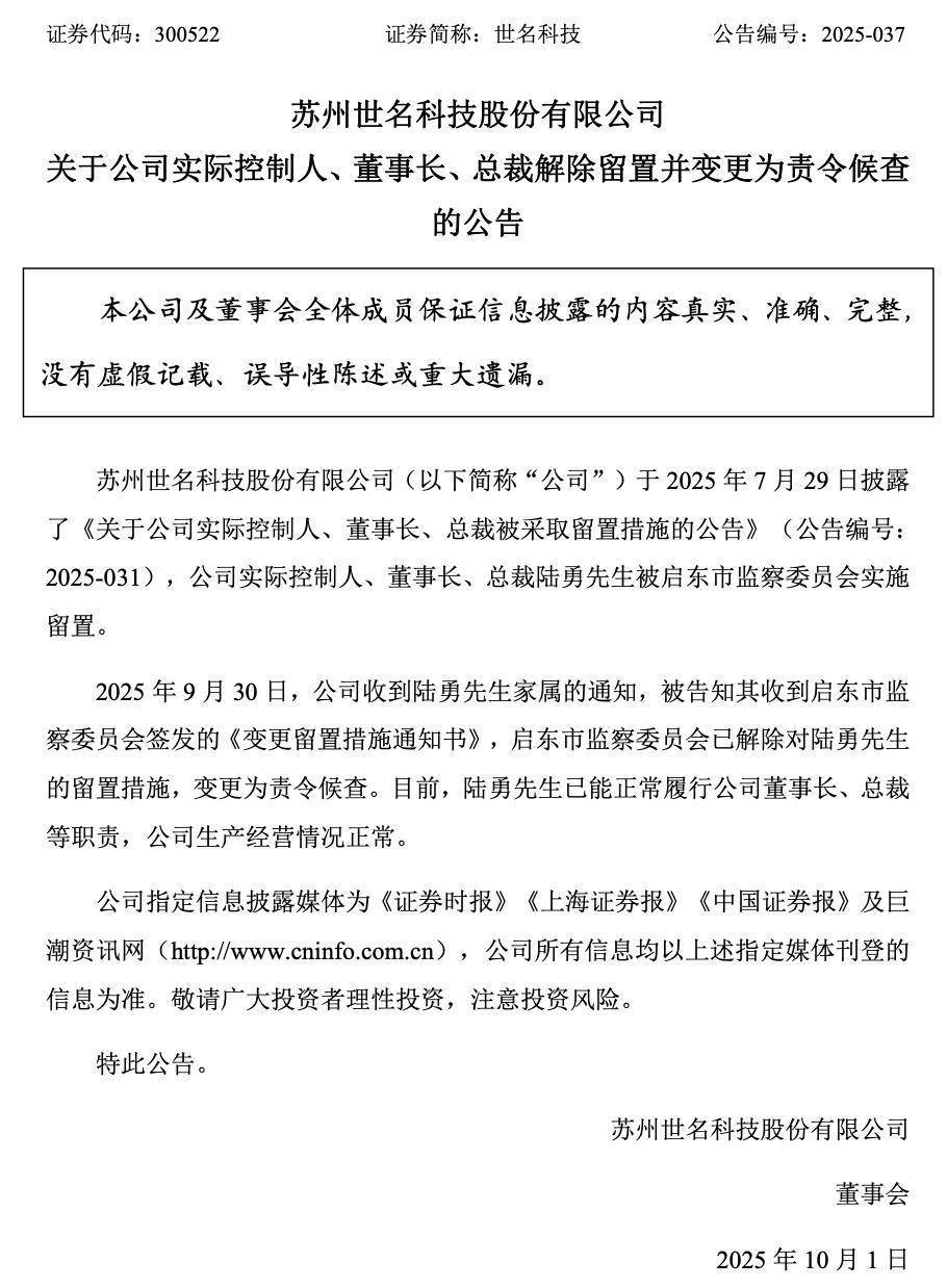 9月30日,世名科技(300522)公告,公司于2025年7月29日披露了《关于公司实际控制人、董事长、总裁被采取留置措施的公告》,公司实际控制人、董事长、总裁陆勇被启东市监察委员会实施留置。